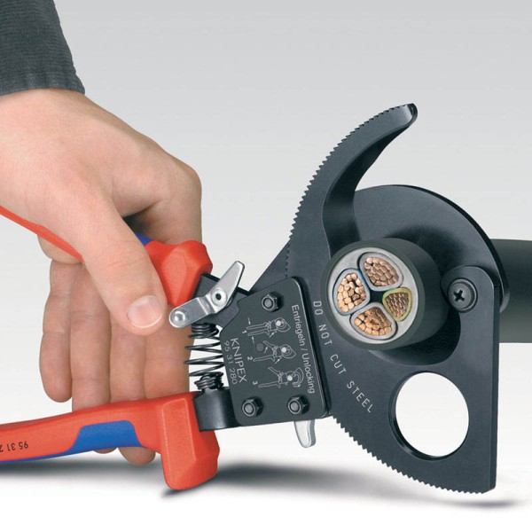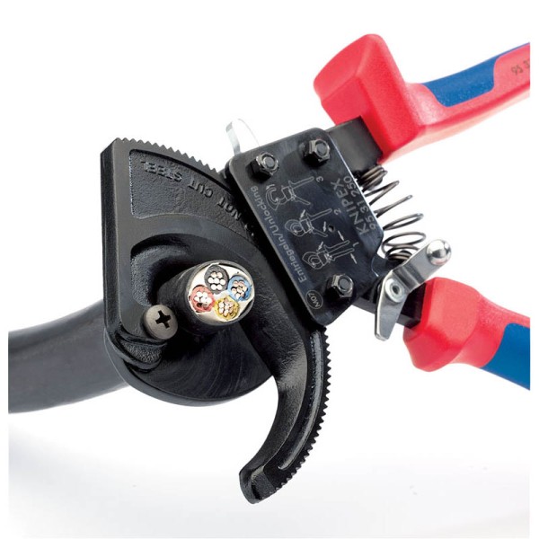 Professional Quality, forged from special grade tool steel, hardened and tempered. Smoothly ground head with cutting edges precision ground and hardened. One hand operation with two-stage ratchet drive for easy cutting without crushing cables. Can be used for wire stripping. 280mm long model will also cut 4 x 150mm² aluminium cable. Heavy duty moulded handles and slipguards for extra safety and comfort. Sold loose.