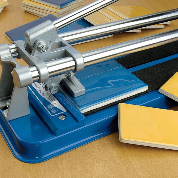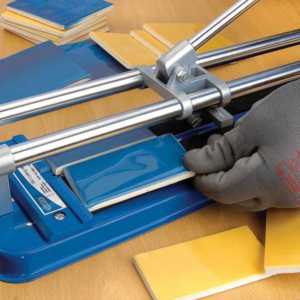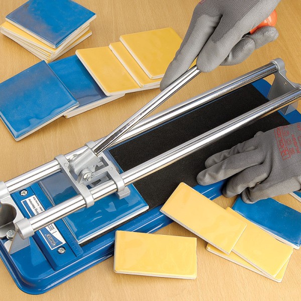 Cuts and breaks ceramic tiles in one easy operation. It has a heavy gauge sheet steel base with foam cushion surface, graduated measuring gauge and replaceable tungsten carbide cutting wheel. The tile is placed on foam cushion cutting base and the wheel is drawn across the tile to cut it. Maximum cutting capacity 300mm long x 10mm thick. Machine size 490 x 140mm. Display carton.