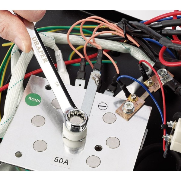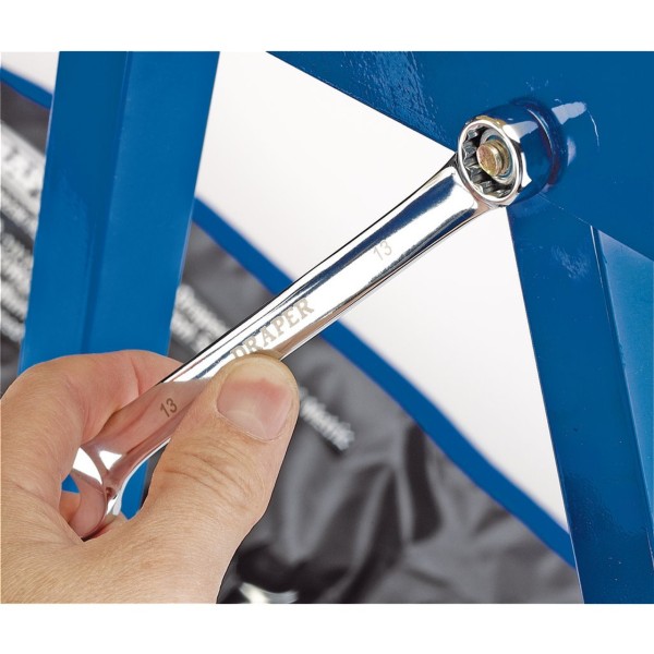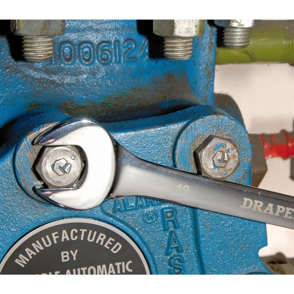 Forged from chrome vanadium steel hardened, tempered and chrome plated for corrosion protection. Draper HI-TORQ® ring end offset at 15°. Jaw offset at 15°. Supplied in vinyl divided wallet with tie cord.