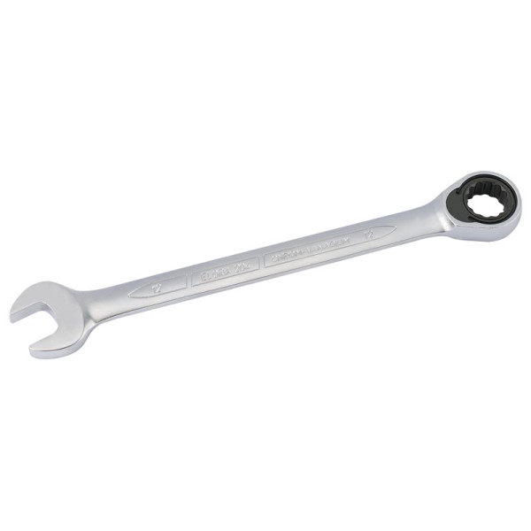 Open end set at 15°. ELO-Drive ring end manufactured with 72 teeth ratcheting mechanism - only 5° movement required to turn fastener, especially useful in confined spaces. Forged from chrome vanadium steel, hardened, tempered and matt chrome plated.