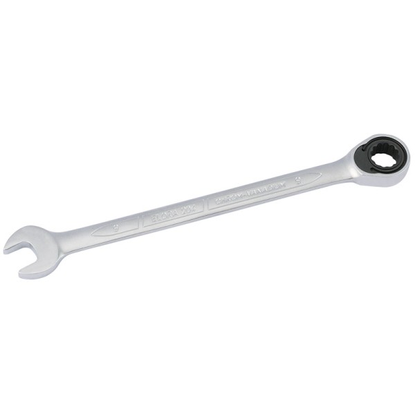 Open end set at 15°. ELO-Drive ring end manufactured with 72 teeth ratcheting mechanism - only 5° movement required to turn fastener, especially useful in confined spaces. Forged from chrome vanadium steel, hardened, tempered and matt chrome plated.