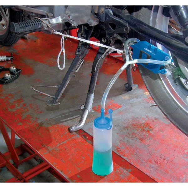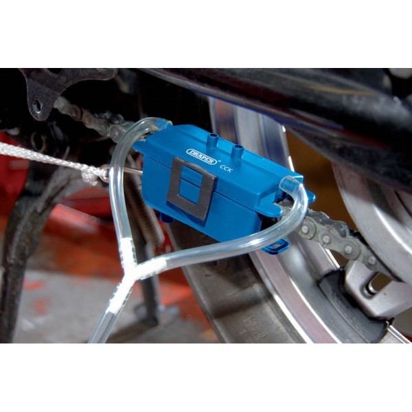 For cleaning of motorcycle chains whilst in-situ. Comprises bottle for holding cleaning fluid, plastic tube, Y piece adaptor and chain bath with cleaning brushes. Easy set up; bath is clamped over chain and the bottle connected to bath via plastic tubes and chain cleaned. Waste fluid is then drained away. Display carton.