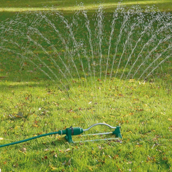 17 hole sprinkler with position oscillation adjustment. Manufactured from strong impact resistant ABS plastic and aluminium. Fitted with an adjustable spray pattern facility. Supplied with 1/2” BSP brass hose adaptor and sprinkler hole cleaner. Display carton.