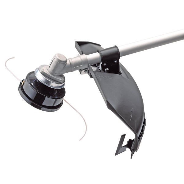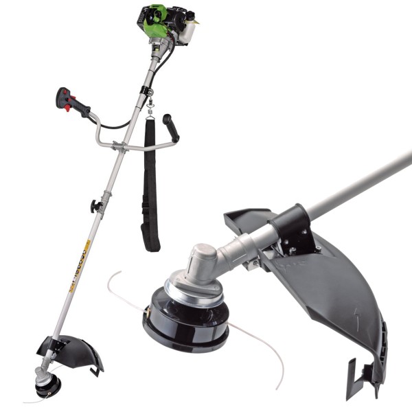 2 stroke petrol engine, Choke for easy starting, On/off switch with safety throttle lever and lock on for starting, Bike handle for comfortable use, Shoulder harness. Supplied with a three-tooth brush cutting blade, "tap and go" double line spool, assembly tools, 0.5L two-stroke mixing bottle and a shoulder strap/harness.