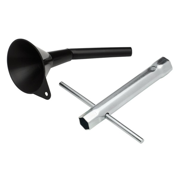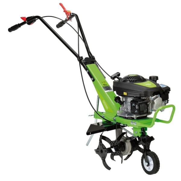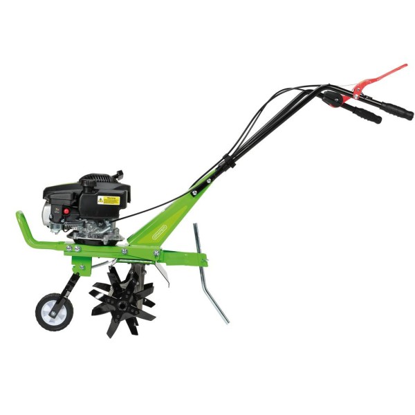 This durable 150cc tiller and cultivator is designed for preparing garden seeding beds and vegetable patches. The 4-stroke petrol engine features a recoil start and variable speed. The heavy-duty gears drive four robust, 4-tooth blades that are capable of a tilling width of 360mm. The adjustable tilling depth is simple to set using the depth control on the drag bar; digging down to a maximum of 130mm. The machine is self-propelled for better manoeuvrability and effortless working. The height adjustable handlebar ensures comfortable use of the controls, which includes the speed adjustment, safety clutch and emergency stop. The front handle and wheel make it easier to move the machine, and the front wheel is easily lifted into a cultivating position. Supplied with spark plug wrench and fuel filling funnel.