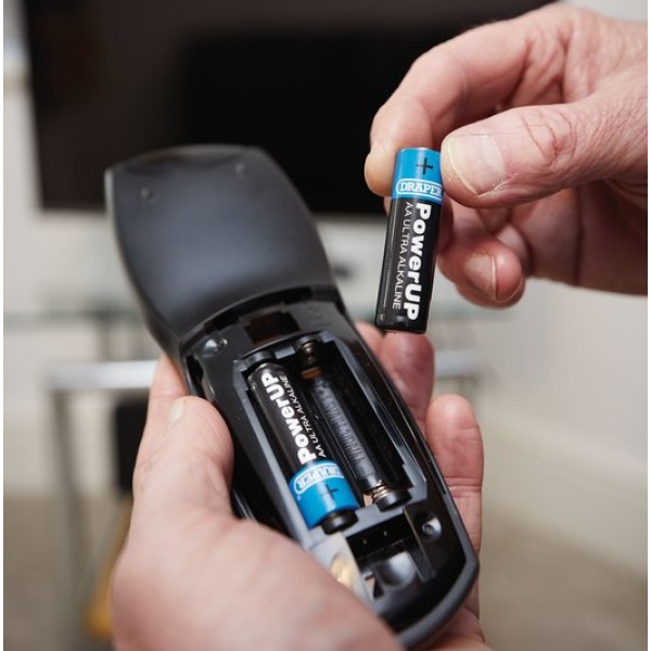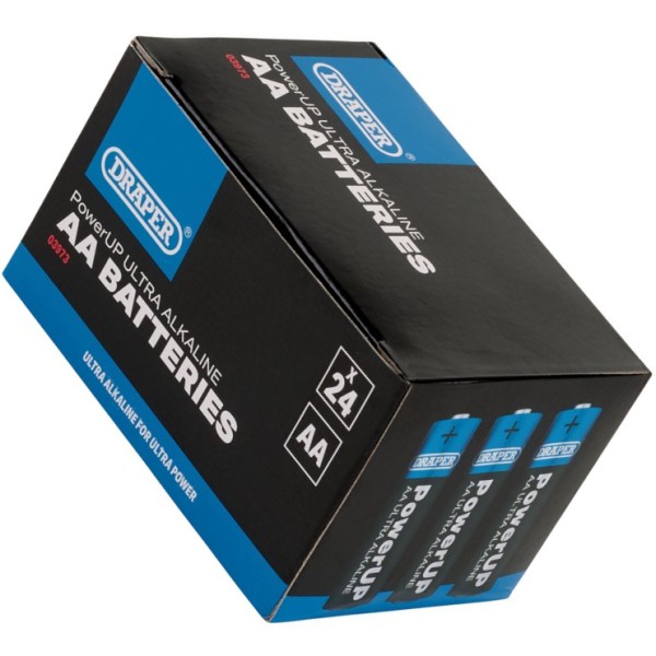 With 20% more capacity than standard alkaline batteries, these multipurpose Draper PowerUP Ultra Alkaline AA batteries are ideal for high-capacity applications. AA batteries are commonly used for powering small torches, measuring or detection tools, and smaller toys and handheld devices, such as cordless phones and TV remotes. These Draper PowerUp AA batteries are designed to be leakproof, and the pack contains 24 batteries.