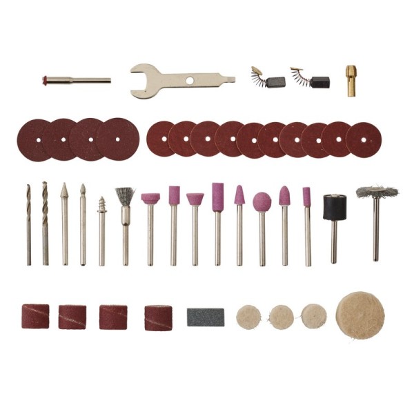 This replacement accessory set includes a collet, grinding stones with shanks, a sanding shank, mandrels (for felt wheels and cut off wheels), stainless steel brushes, diamond cutters, HSS drill bits, sanding discs, sanding bands, felt wheels, cut-off wheels, a whetstone and a wrench. For use with rotary tools.