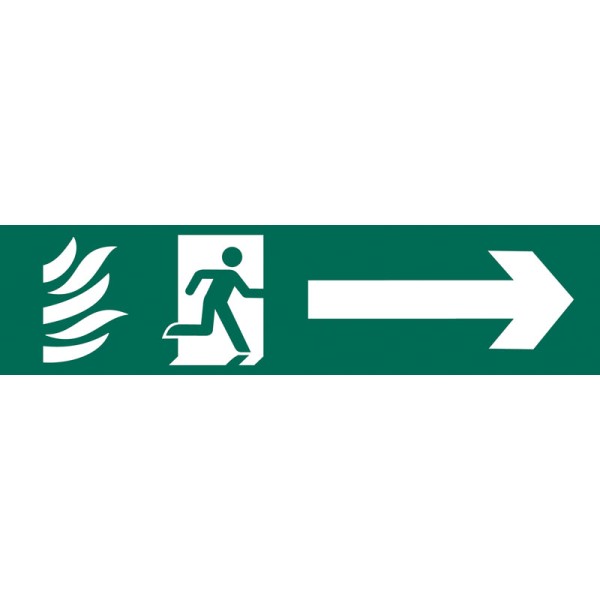 'Running Man Arrow Right' Safety Sign printed with UV and fade resistant ink. Manufactured from 1mm PVC thats sized 200 x 50mm with ultra strong water based adhesive for fixing to the wall.