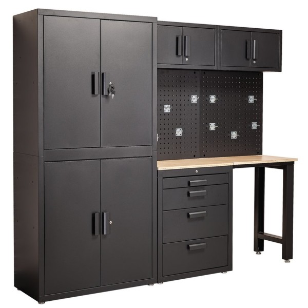 This complete steel storage unit combines one tall cabinet with four doors and three fitted shelves, two wall cabinets, a base cabinet with four drawers and a pressed wood worktop. There are also two back panels for holding tools and equipment. It is styled with a matt black painted finish and is fitted with adjustable feet for stability. A fully lockable system is in place for security (six keys provided). The workstation is supplied semi-flat packed and requires assembly. This is a complete storage solution (individual components are not available separately).