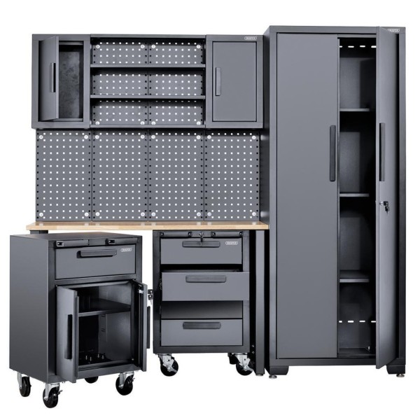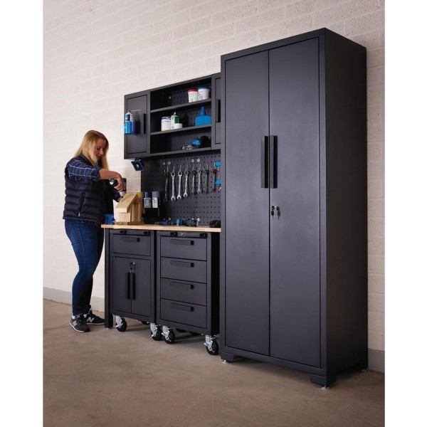 This complete steel storage unit combines one tall cabinet with two doors and three fixed shelves, a wall shelf unit with two cupboards, two roller cabinets and a pressed wood worktop. There are also four back panel pegboards for holding tools and equipment. It is styled with a matt black painted finish and is fitted with adjustable feet for stability. A fully lockable system is in place for security (six keys provided). The workstation is supplied semi-flat packed and requires assembly. This is a complete storage solution (individual components are not available separately).