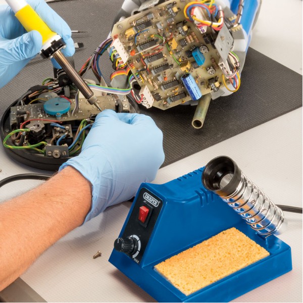 Multipurpose 40W soldering station is suitable for most soldering tasks. Manufactured with a overheat protection device fitted with a manually adjustable heat output dial. The soldering iron has an integral soldering iron stand and tip sponge. Display packed.