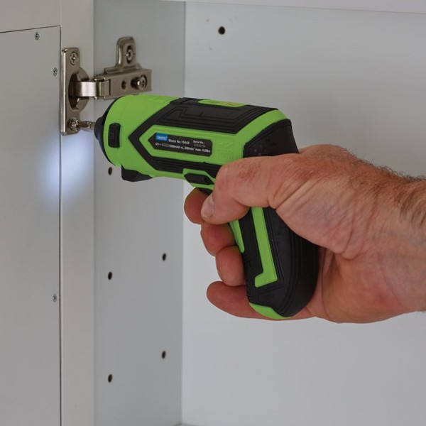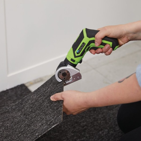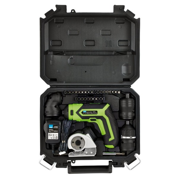 This multifunction 1/4" hex screwdriver and cutting tool is designed for driving screws and cutting soft materials such as leather, card and fibre up to 6mm thick. It is intended for domestic and infrequent light trade use. The screwdriver features four interchangeable heads for driving and cutting, an integral 1.5Ah battery and a one-hour charger. The different heads allow users to drive screws at an angle or eccentrically. The screwdriver has an LED worklight and comes with 28 screwdriver bits and an adaptor.