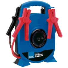 Retractable booster cables housed in a plastic case that's fitted with an LCD display showing battery voltage and alternator charge rate. Fitted with a retractable winding handle, anti-surge protection and 8 illuminating LEDs.The cable is 29mm wide and 3.5m long and insulated with PVC for added durability and attached with heavy duty handles with a PVC cover. Suitable for 12V/24V systems for petrol engines with a maximum 5.5L capacity and diesel engines up to 3L found in cars, light commercial v..