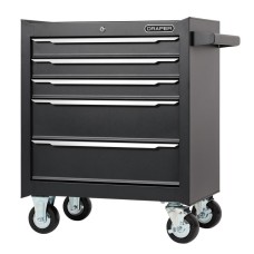 This practical 5-drawer roller tool cabinet is constructed from sheet steel and has a protective powder coated finish that guards against scratches and corrosion. The spacious drawers have a stylish aluminium trim and are equipped with ball bearing sliders for smooth operation and a 2mm EVA liner to protect tools and prevent them from sliding around. The worktop is also lined with EVA for added protection. For easy manouverability, the cabinet includes a sturdy pull handle and is fitted with fou..