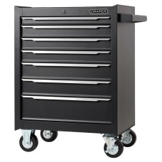 This practical 7-drawer roller tool cabinet is constructed from sheet steel and has a protective powder coated finish that guards against scratches and corrosion. The spacious drawers have a stylish aluminium trim and are equipped with ball bearing sliders for smooth operation and a 2mm EVA liner to protect tools and prevent them from sliding around. The worktop is also lined with EVA for added protection. For easy manouverability, the cabinet includes a sturdy pull handle and is fitted with fou..