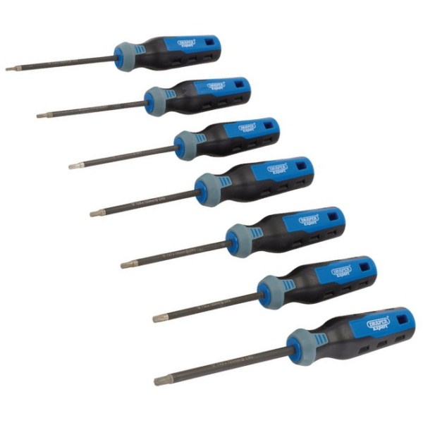 Expert Quality, seven-piece Draper TX-STAR® diamond-tipped screwdriver set is designed for professional use. The diamond tip coating enables greater grip, better torque transfer through to the screw and less cam out, preventing damage to screw heads.