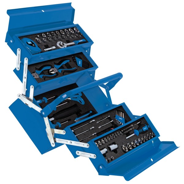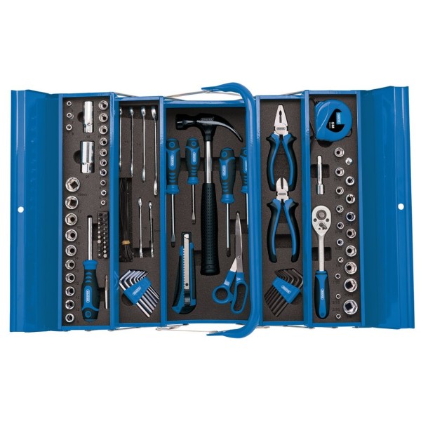 Vast selection of commonly used tools for the workshop and around the home contained inside a steel cantilever toolbox. Featuring a 45-tooth reversible ratchet, 16oz claw hammer, combination pliers, side cutters, a range of screwdrivers, a tape measure and a wide selection of screwdriver bits, sockets and hex keys. Lining the toolbox are high density foam inserts to help organise storage and clearly spot when tools are missing. Cantilever toolbox manufactured from sheet steel with five trays and measuring 420 x 200 x 200mm.