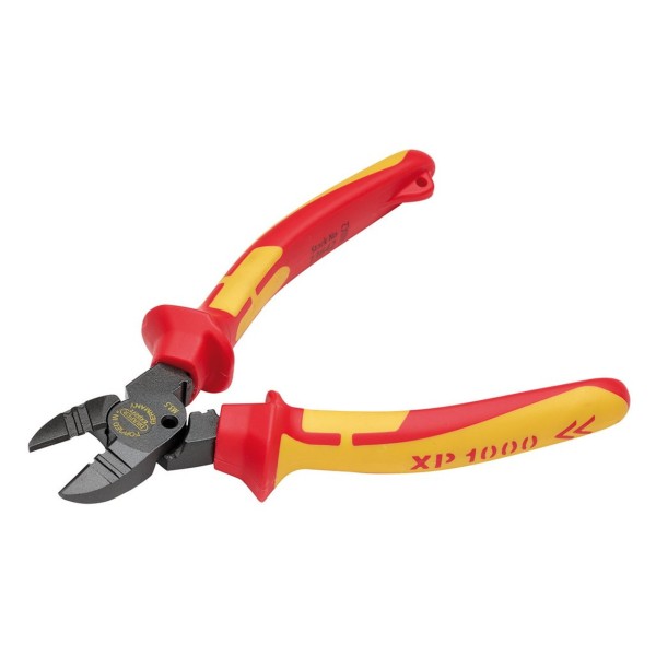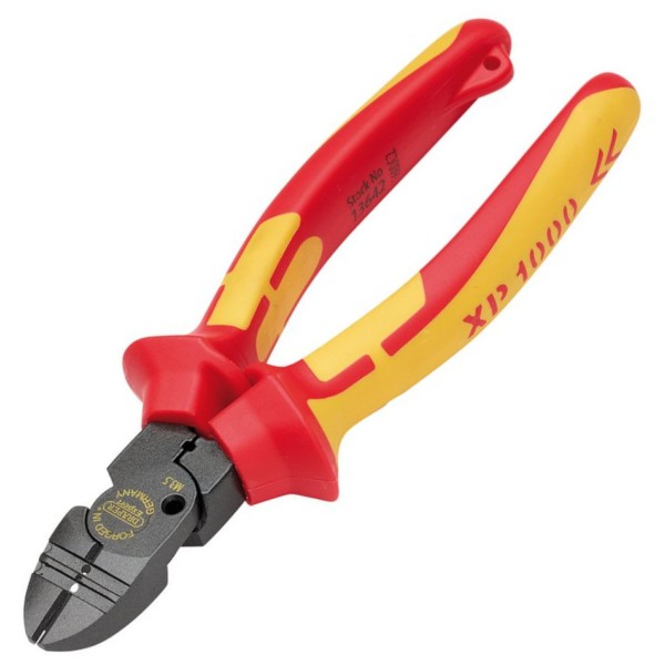 Expert quality XP1000®, manufactured from premium steel forged in Germany. This convenient combination cutter is a all-in-1 side cutter, 3.5mm pattress screw shear, wire bending anvil and 1.5 and 2.5mm wire stripper. Two part bi-material ergonomic soft grip handle allows maximum grip and user comfort. Handle equipped with tethering hole for attachment to a lanyard while working at height. Tested to 10,000V, these pliers are suitable for working on live circuits of 1,000V AC and 1,500V DC.