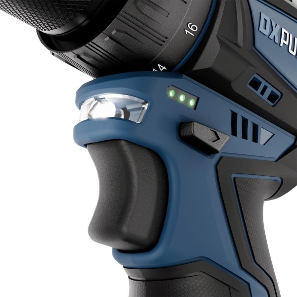 This cordless drill driver is part of the DXPULSE 12V Interchange Series. The brushless motor enhances efficiency, offering more power and a longer battery life. It features a 10mm metal keyless chuck, 18+1 torque settings, forward/reverse, a 2-speed gearbox, a variable speed trigger, and an LED worklight. Its compact design makes it ideal for use in tight spaces. Weighing less than 1 kg, it is easy to use, and the soft grip handle ensures comfort during extended use. It is powered by a 12V lithium-ion battery, and there is an LED battery level indicator. Comes complete with 2 x 2.0Ah batteries and 1 x charger, a range of screwdriver bits, bit holder and HSS drill bit in a sturdy plastic storage case.