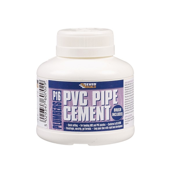 Everbuild EVBP16PIPE is a PVC pipe cement is a non-drip, thixotropic solvent based pipe cement and combines a long open time with a rapid rate of bond strength development. Conforms to BS26209.