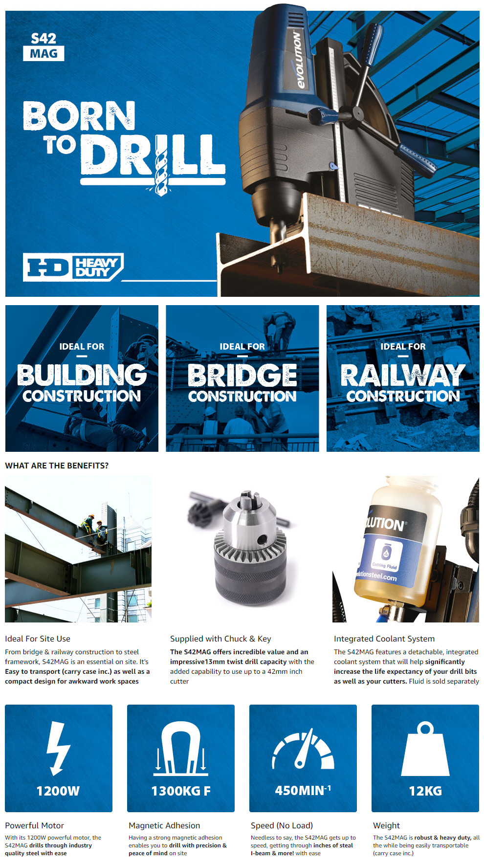 Industrial Quality - This incredible Magnetic Drill is deceptive in its capabilities; although small in size it is well-suited for heavy-duty industrial and fabrication work. The EVOMAG42 is versatile, accurate and portable with strong magnetic adhesion.