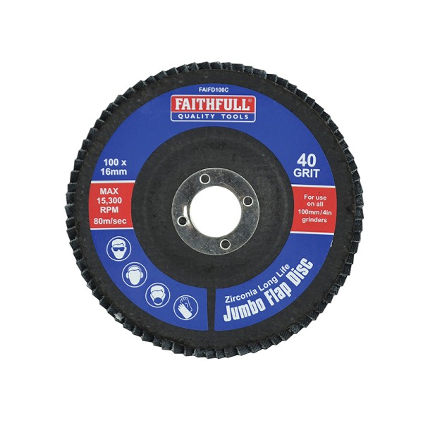 Faithfull Abrasive Jumbo Flap Discs contain up to 40% more abrasive than standard flap discs, providing a considerably longer working life. Manufactured from long lasting Zirconia Alumina. Resin bonded for extra strength and durability.