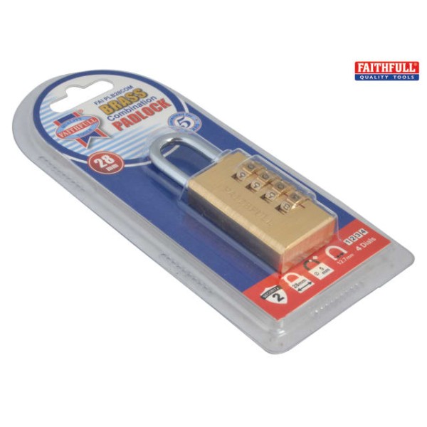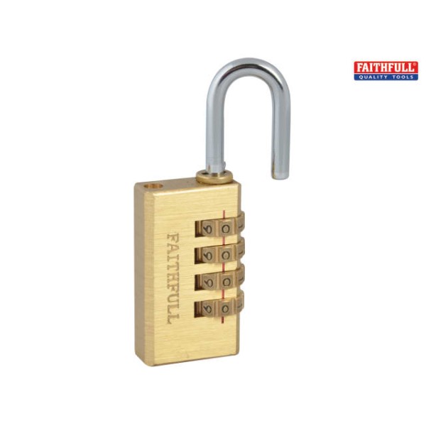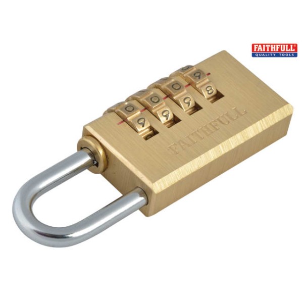 The Faithfull Combination Padlock has a solid brass body with a 4-pin brass tumbler mechanism. It has a hardened and plated steel shackle encompassing a self locking action.
