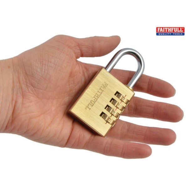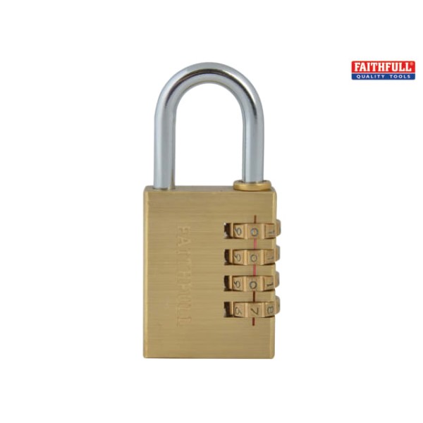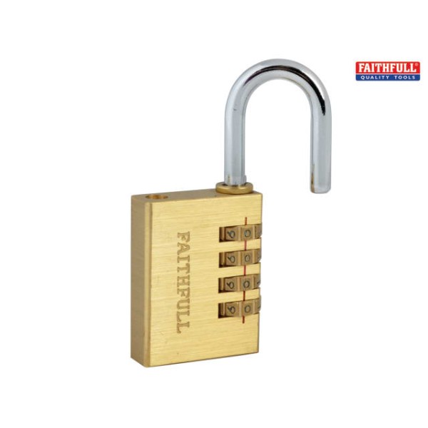 The Faithfull Combination Padlock has a solid brass body with a 4-pin brass tumbler mechanism. It has a hardened and plated steel shackle encompassing a self locking action.