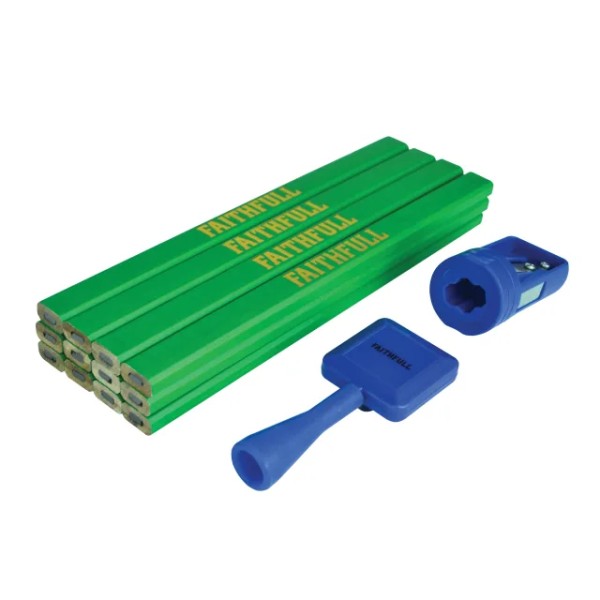 This Faithfull Carpenter's Pencil Set contains 12 hard pencils suitable for general carpentry, a retractable pencil holder and pencil sharpener. Almost any material can be marked out with these carpenter's pencils, with the exception of some metals and polished or glazed surfaces. The pencil leaves a clear visible line irrespective of material or grain. Hard lead pencils are suited to use on harder surfaces such as hardwoods, brick and plastered walls.