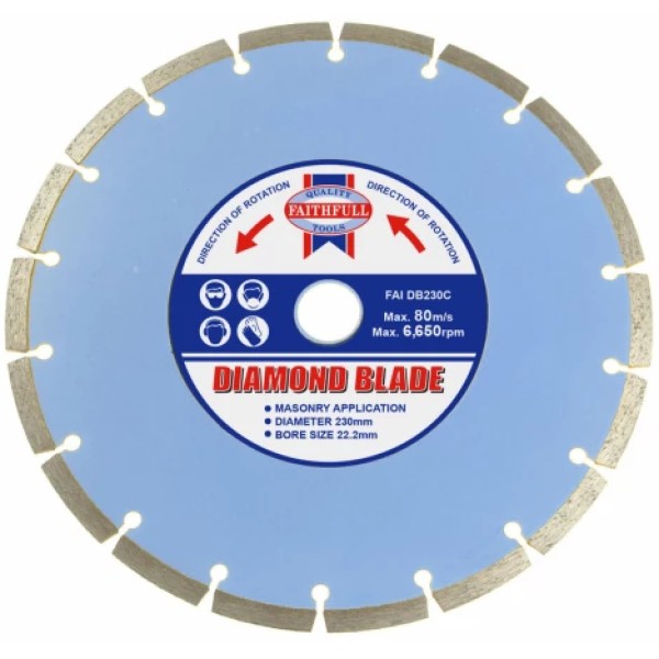 This Faithfull Contract Diamond Blade has 7mm sintered, diamond impregnated segments. Suitable for wet and dry cutting, and ideal for general cutting applications such as tiles, paving slabs, breeze blocks and brickwork.