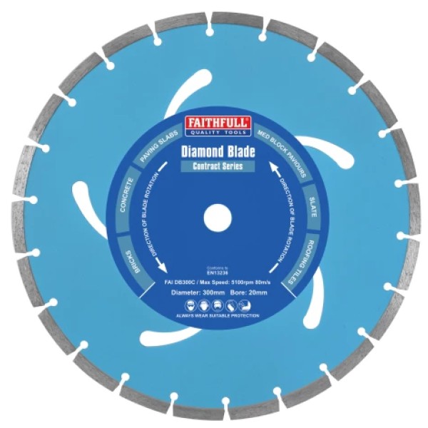 This Faithfull Contract Diamond Blade has 7mm sintered, diamond impregnated segments. Suitable for wet and dry cutting, and ideal for general cutting applications such as tiles, paving slabs, breeze blocks and brickwork.