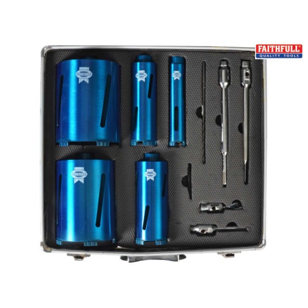 The Faithfull FAIDCKIT11 11 Piece Diamond Core Drill Kit is suitable for brick and concrete blocks etc. They are ideal for plumbing, electrical, engineering installation and general building tasks. All cores are 1/2 inch. BSP threaded with 8mm turbo segments.