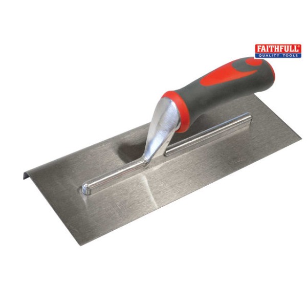 Faithfull edging trowels are commonly use to apply a rounded finished edge to concrete and render. The carbon steel blade with one long curved edge is fitted with a full sized soft grip handle for user comfort.