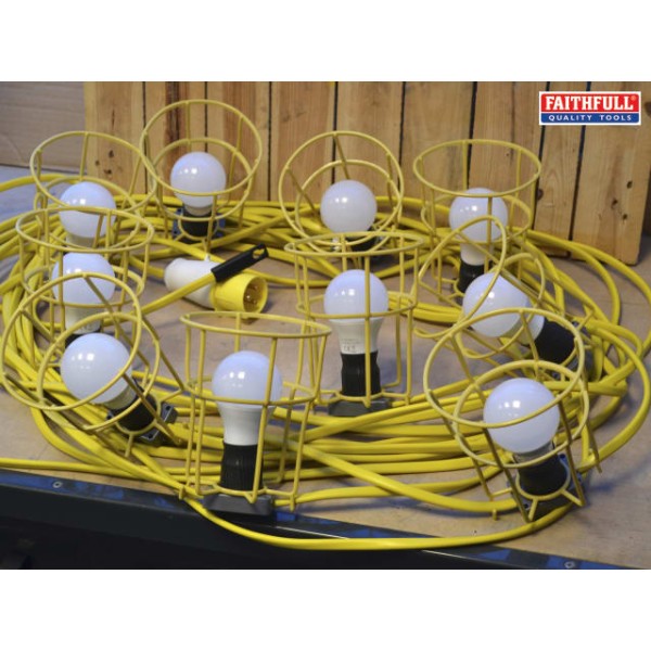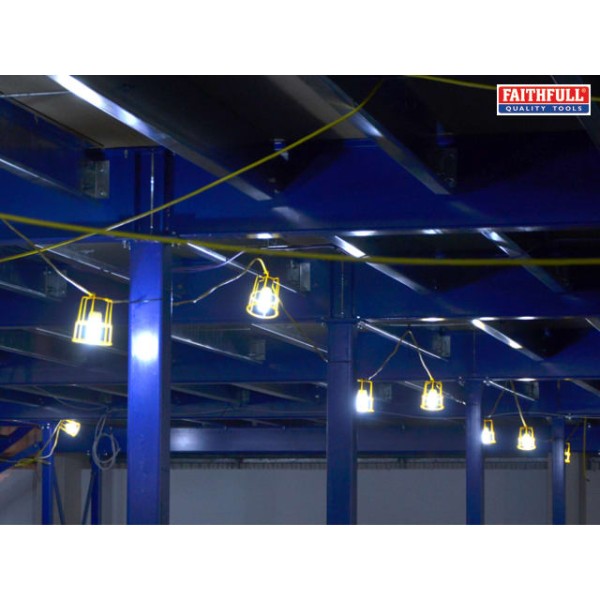 The Faithfull LED Festoon Light Set, comes with a 22 metre arctic cable supplied with 10 x bulbs (110 Volt), each bulb is protected by a lightweight yellow plastic cage. These festoon lights will provide a very effective solution to illuminating a large area on site by hanging the lights in one room and to another across a landing etc., there will be instant light in three locations without the possibility of shadows that can be caused by using tripod lighting.