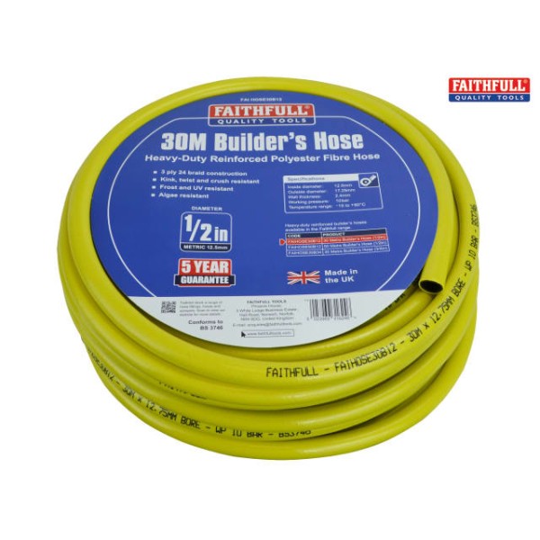 The Faithfull Builder's Hose is a superior quality UK manufactured hose, ideal for worksite use. It is made from heavy-duty polyester, reinforced with a 24 braid fibre mesh for extra strength, making it both strong and flexible. The tough 3ply construction is kink, twist and crush resistant and highly resilient to UV light, frost and algae and is easy to clean.