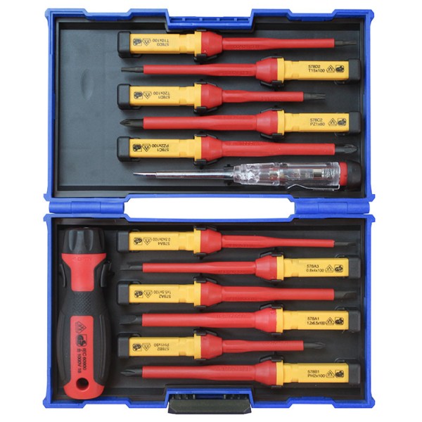 The Faithfull 13 Piece Interchangeable VDE Screwdriver contains a selection of the most popular VDE screwdriver blades and a soft-grip handle together in a compact case.