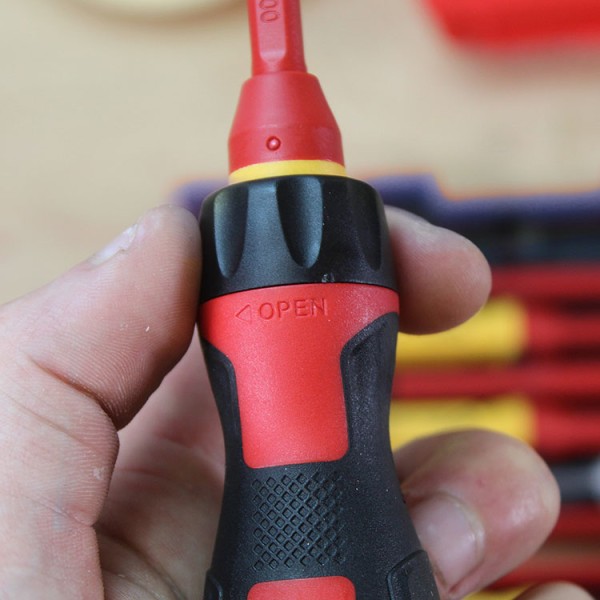 The set includes eleven Slotted, Phillips, Pozidriv and Star blades and a soft-grip handle that features an automatic locking system. A twist to release function allows the blades to be changed quickly with the minimum of fuss.