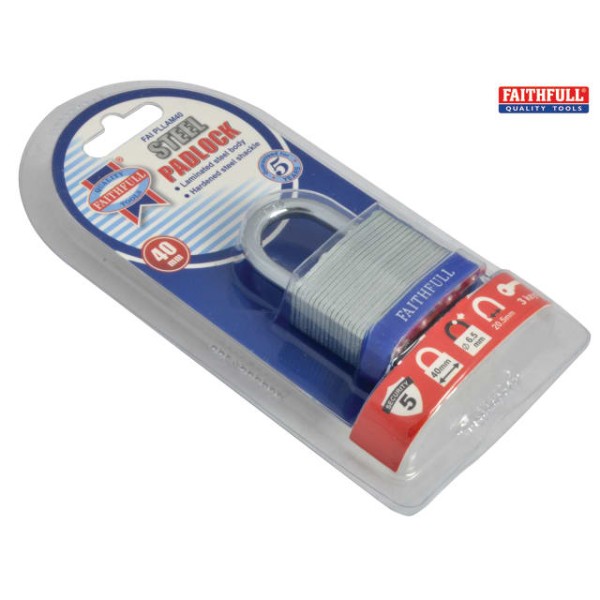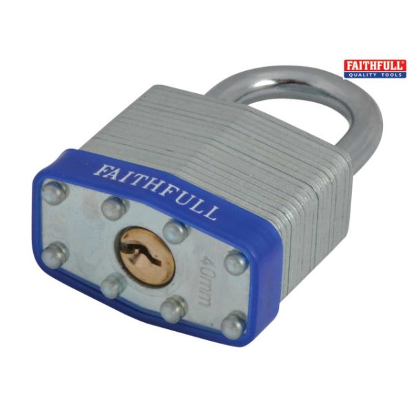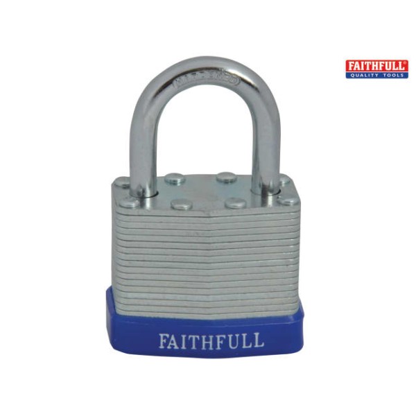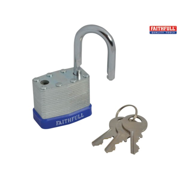 The Faithfull Laminated padlocks are manufactured using individually galvanised plates with a case hardened steel shackle. They are designed for use where a higher level of security is required. Each lock features a high strength, brass cylinder mechanism that is accurately machined, durable and rust resistant and has a stainless steel shackle spring.