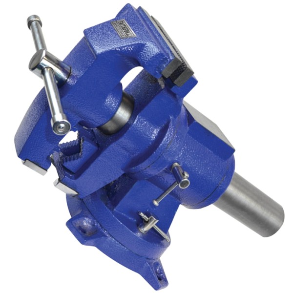 This strong durable vice offers many features including a four point bench mounting 360° swivel base and an ingenious rotating jaw head that allows the selection of either a standard parallel serrated jaw, or pipe jaws with an integral V-jaw assembly depending on the work in hand. The jaw head can be pivoted 180° either side of vertical and locked in position, meaning it is able to provide the perfect working angle for any application.
