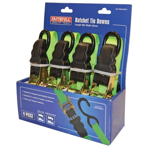 These Faithfull Ratchet Tie-Downs are manufactured from a 25mm wide triple layer Terylene webbing which is weatherproof, cut and abrasion resistant. The ratchet and S style hooks ensures that loads are secured quickly and efficiently and provide ease of use.