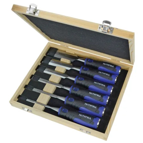 The Faithfull 6 Piece Soft Grip Chisel Set is supplied in a hinged wooden storage case.