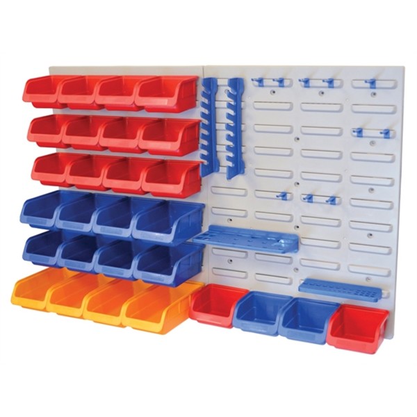 This Faithfull 43-piece wall mounted storage system is a quick and easy way to organise tools, fixings and accessories with easy access. The set comprises two sturdy wall panels with 28 plastic bins for small parts such as nails, anchors and screws, and various tool holders that will accommodate screwdrivers, drill bits, combination spanners and many more items.