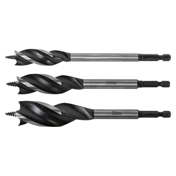 This 3 piece Faithfull Tri-Point Speed Auger Bit Set contains sizes: 16, 20 and 25mm.