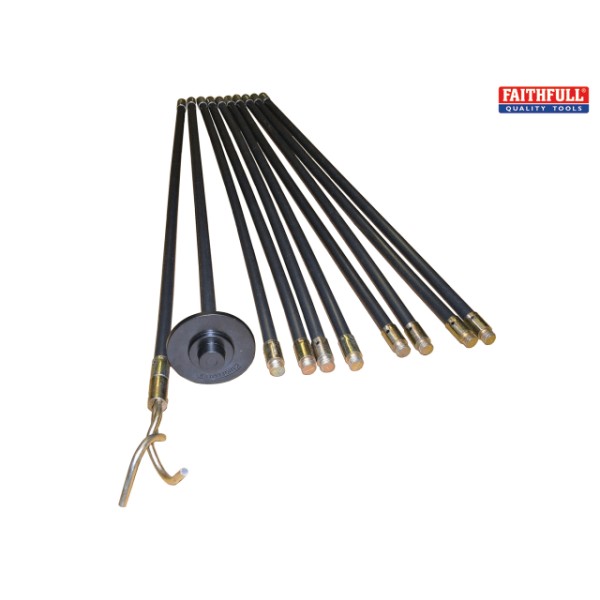 These Faithfull drain rods can be used to clean and remove obstructions from most domestic 100mm (4in) underground drainage pipes.The set consists of ten flexible, screw together rods which can reach up to 9 metres in length when fully assembled. Each 920mm polypropylene drain rod has crimped and pinned rustproof connectors for extra strength and the kit is supplied complete with a 100mm rubber plunger and a 50mm double worm screw.