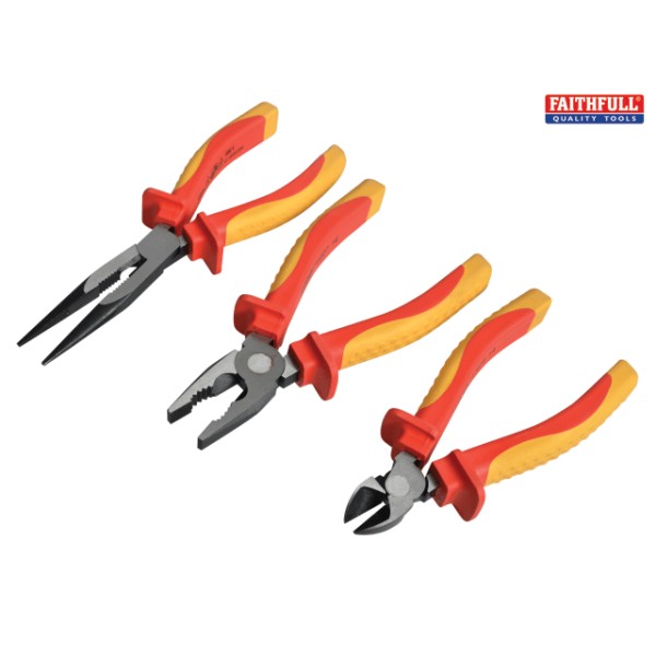 The Faithfull VDE Plier Set has been designed for use by professional Electricians. It contains the 3 most commonly used pliers in the electrical trade: combination pliers, long nose pliers and side cutters.