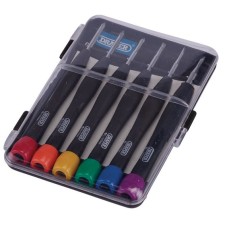 Hardened, precision ground steel blades with nickel plated steel bodies with swivel tops. in plastic case.Contents: 3 plain slot and 3 cross slotHardened, precision ground steel bladesNickel plated steel bodies with swivel topsContents3 x Plain slot screwdrivers: 1.0, 1.4, 2.0mm3 x Cross slot screwdrivers: No.00, No.0, No.1..