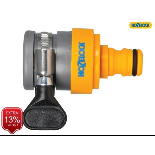 The Hozelock Round Tap Connector designed for round and oval spout taps. The fitting is sealed to the tap by tightening the stainless steel clip.