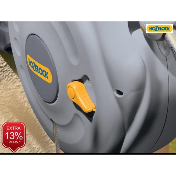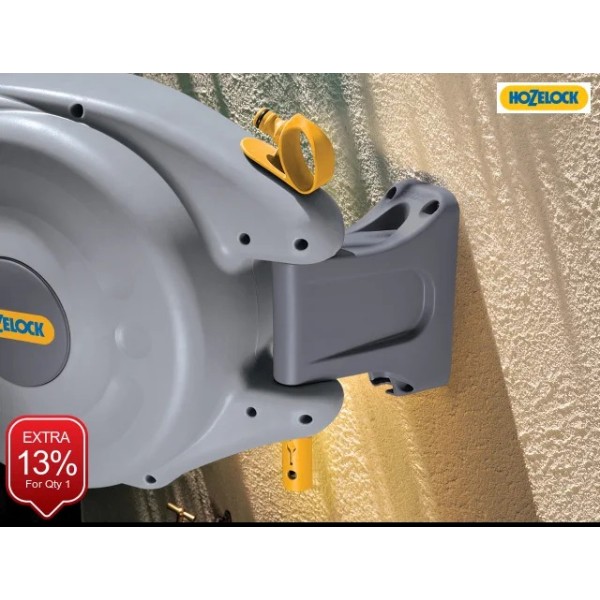 The Hozelock AutoReel has a re-wind mechanism, combined with an internal spring, means that the hose is re-wound onto the drum with the minimum of effort. The user only has to walk the hose back to the reel and the ratchet mechanism means that the hose only re-winds when you want it to. A safety lock affords additional protection against accidental re-wind. The reel is wall-mounted and swivels through 180° to allow the hose to be pulled out in any direction from the wall.