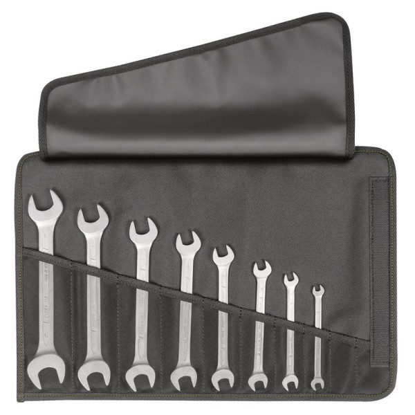 This double-ended spanner set by Elora is a limited edition marking the company's 100-year anniversary. Made from chrome vanadium steel and finished with a matt chrome plating for corrosion protection, these spanners are both strong and durable. The set comes inside a black roll-up storage bag that features Elora's 100-year anniversary logo.