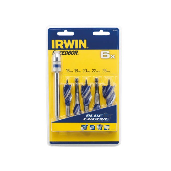 The Irwin Blue Groove 6x drill bits are ideal for drilling wood and offer 6x faster drilling penetration than a standard flat bit. Their'Tri-Flute' design allows for faster chip ejection and their full screw tips ensure ease of use and pull through.